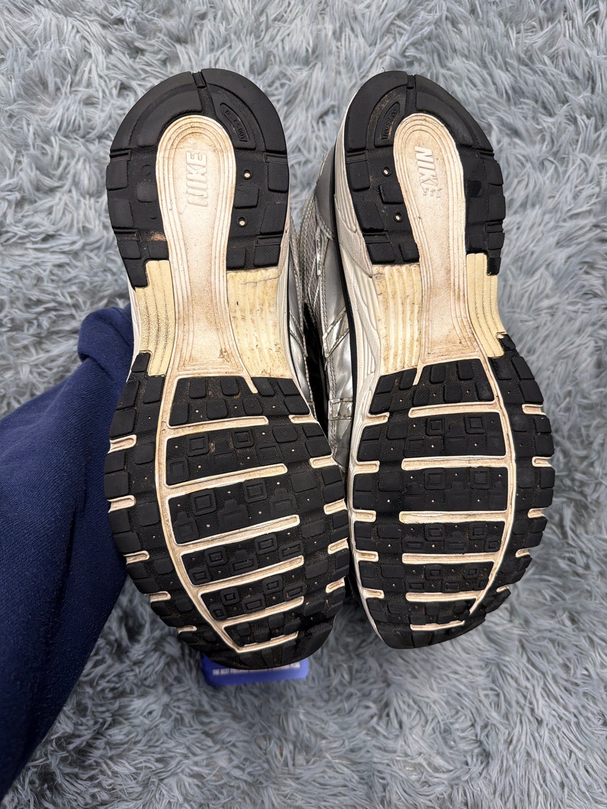 Well-worn pair with visible signs of use. Soles and uppers show wear, and insoles are missing. Still wearable but priced accordingly. Please check all photos carefully before buying.