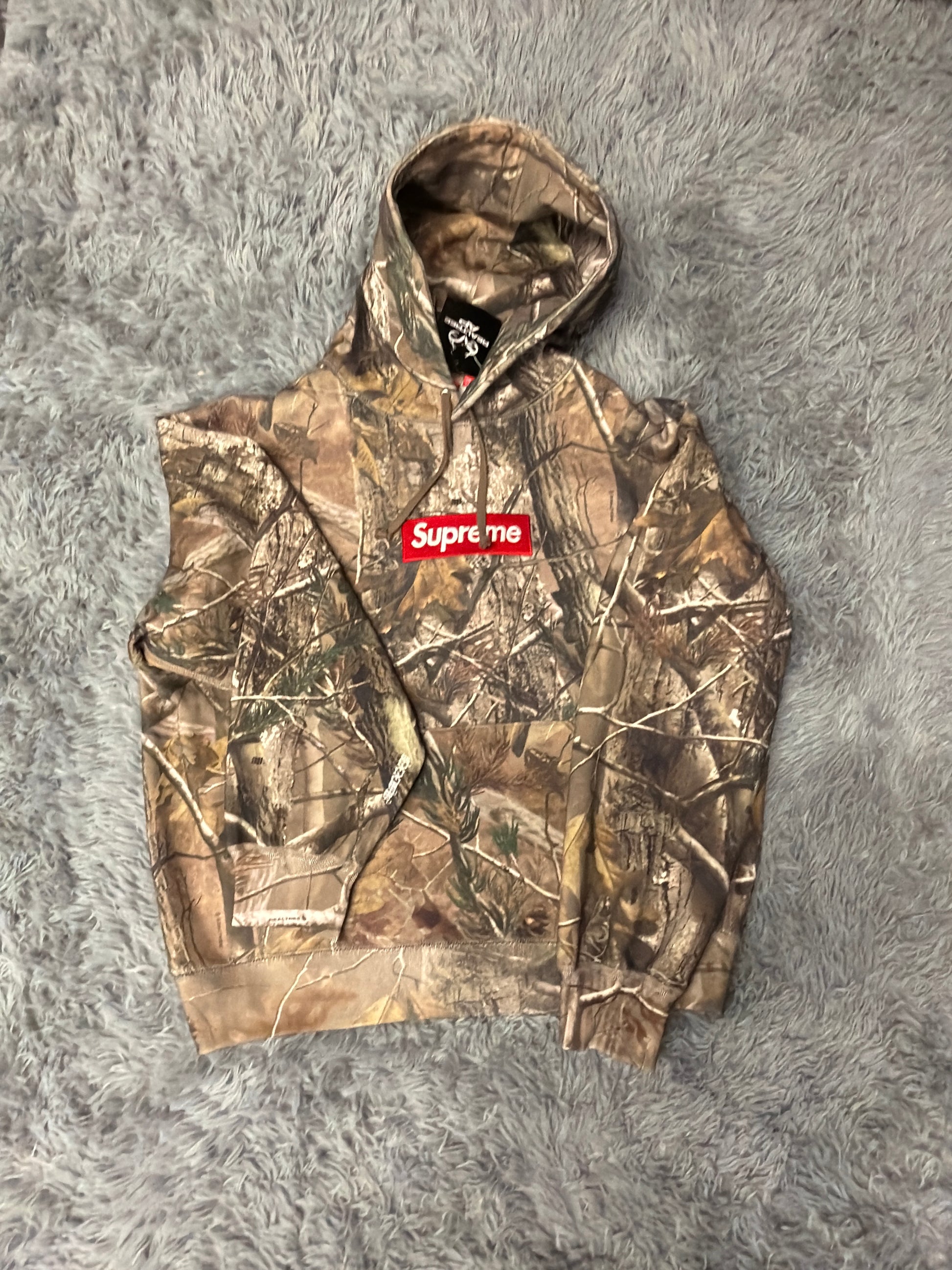 Classic Supreme Box Logo hoodie in the iconic camo colorway, featuring the red box logo embroidered on the chest. Heavyweight cotton fleece with a premium feel, ribbed cuffs and hem, and adjustable drawstring hood.